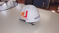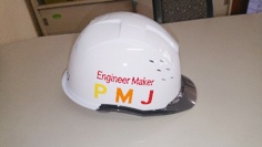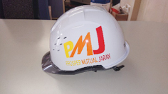 安全を重視したヘルメットはもちろん、自社のデザインでヘルメットの制作できます。写真はPMJのロゴを入れた株式会社ヨシモリ仕様のヘルメットです。